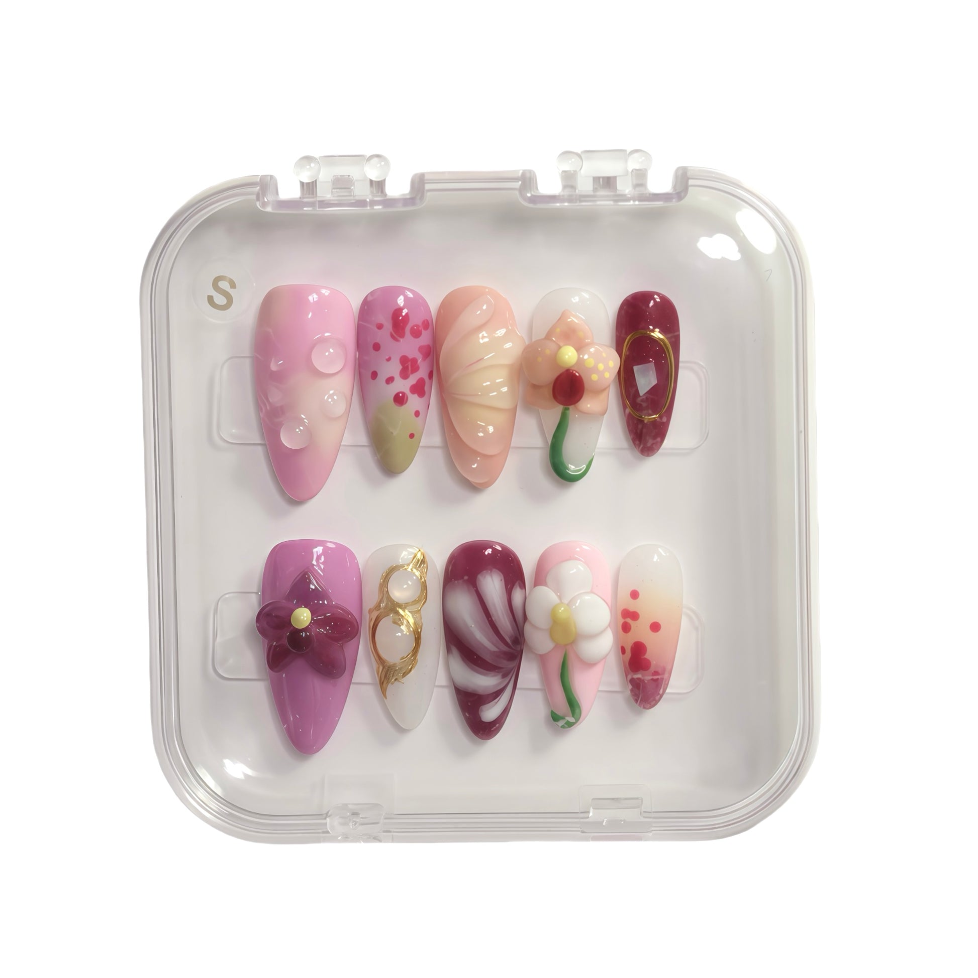 Every set comes with a FREE Toolkit includes: acrylic nail case and all complimentary tools necessary for wearing the design - sticky tabs x 24 pcs in 12 sizes, cuticle tool x 1, dehydrating wipe x 1, nail file x 1