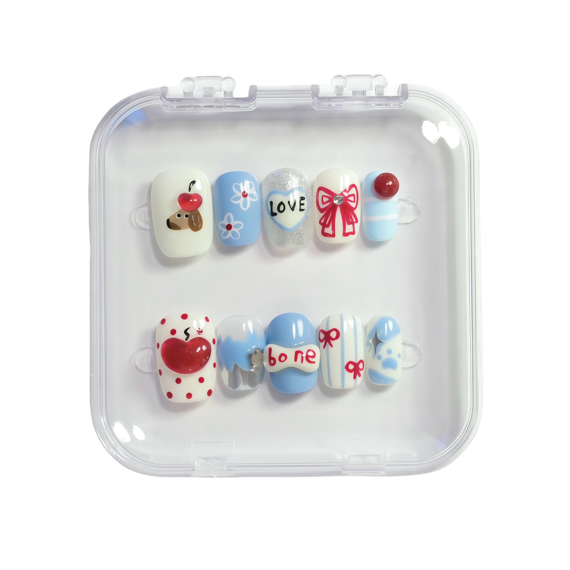 Every set comes with a FREE Toolkit includes: acrylic nail case and all complimentary tools necessary for wearing the design - sticky tabs x 24 pcs in 12 sizes, cuticle tool x 1, dehydrating wipe x 1, nail file x 1