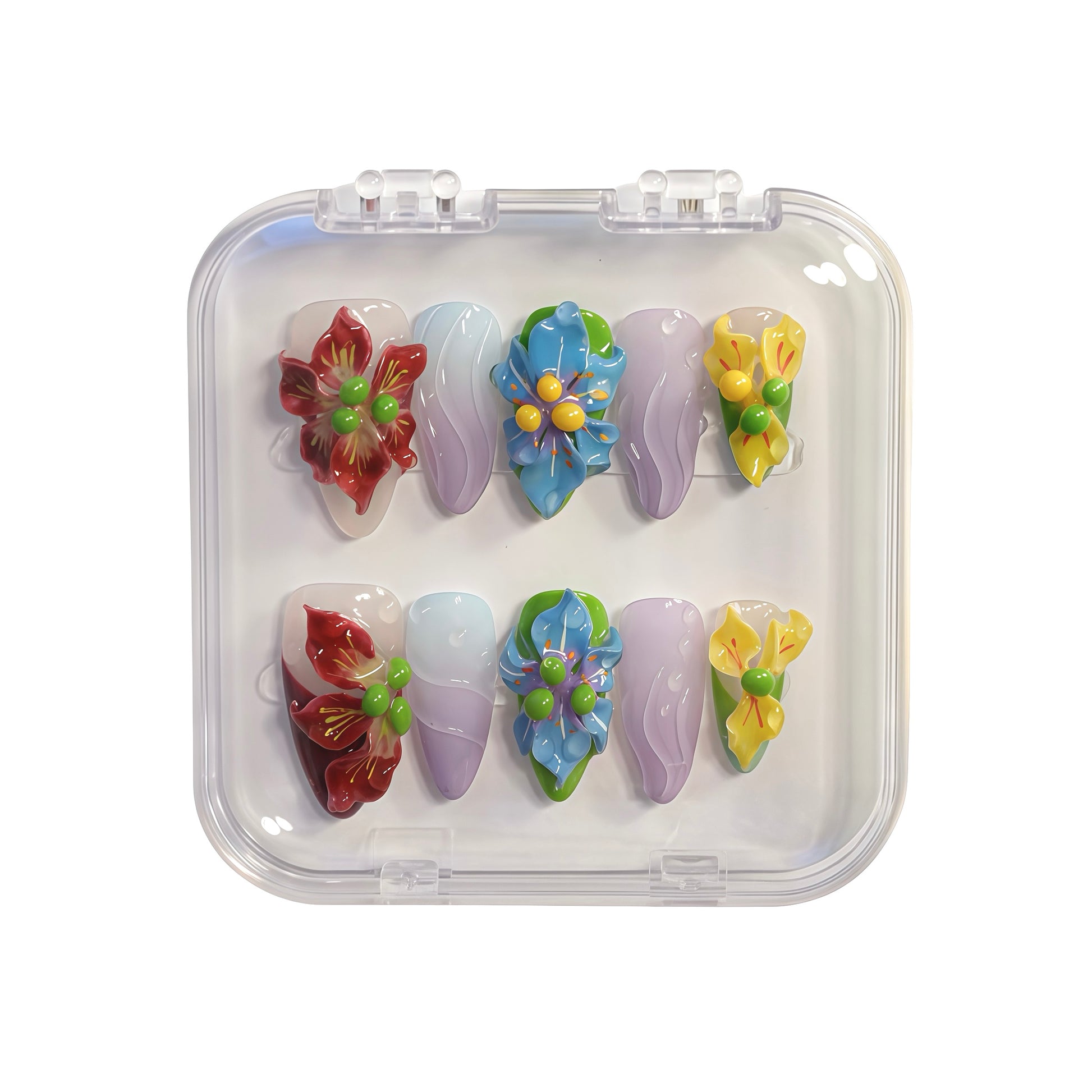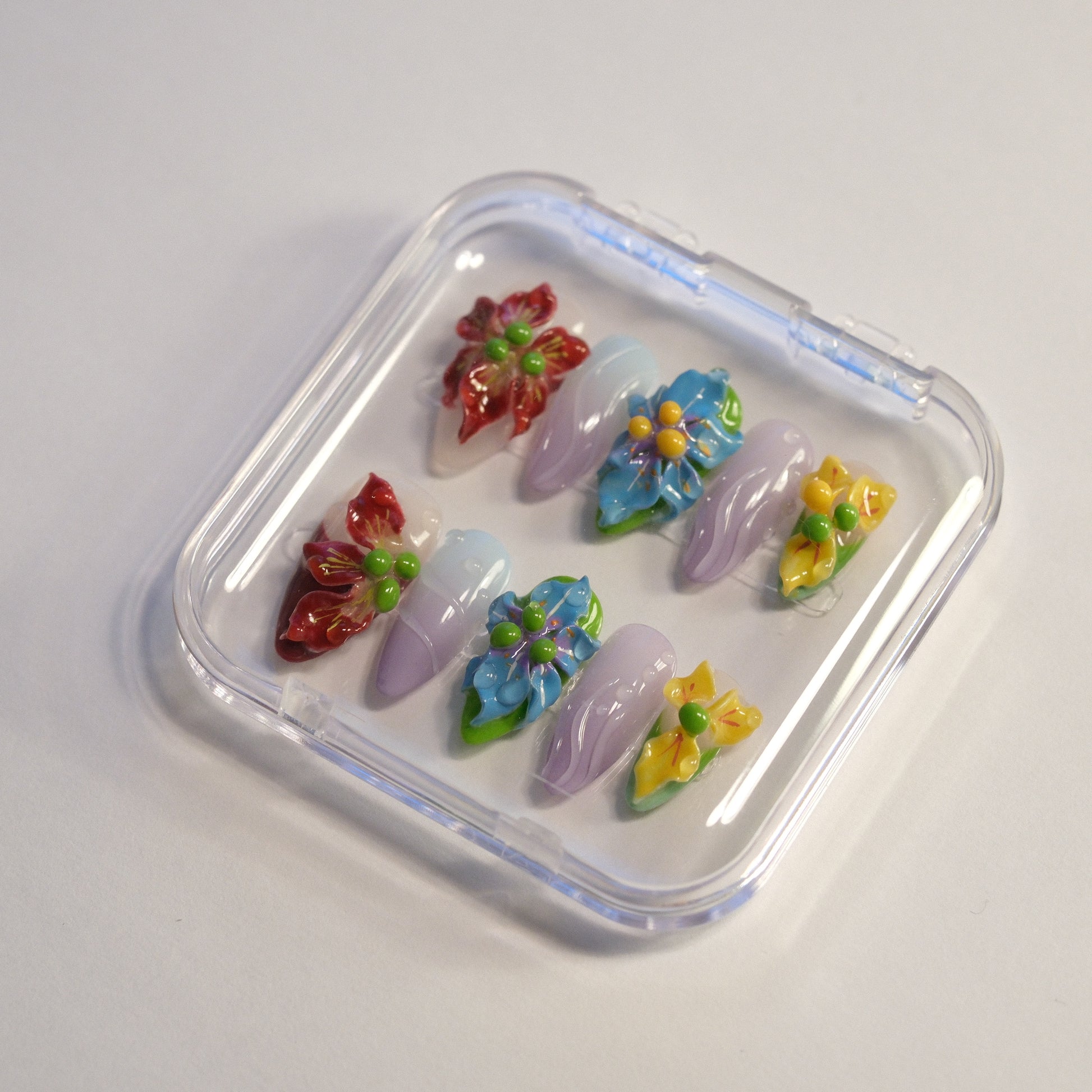 "the florist" captures the beauty of nature with handcrafted press-on nails featuring 3D handmade floral designs. Each set showcases unique, sculpted flowers in a variety of colors, bringing the charm of a blooming garden to your fingertips. Perfect for special occasions or everyday elegance, these nails offer a touch of floral artistry to elevate your style.