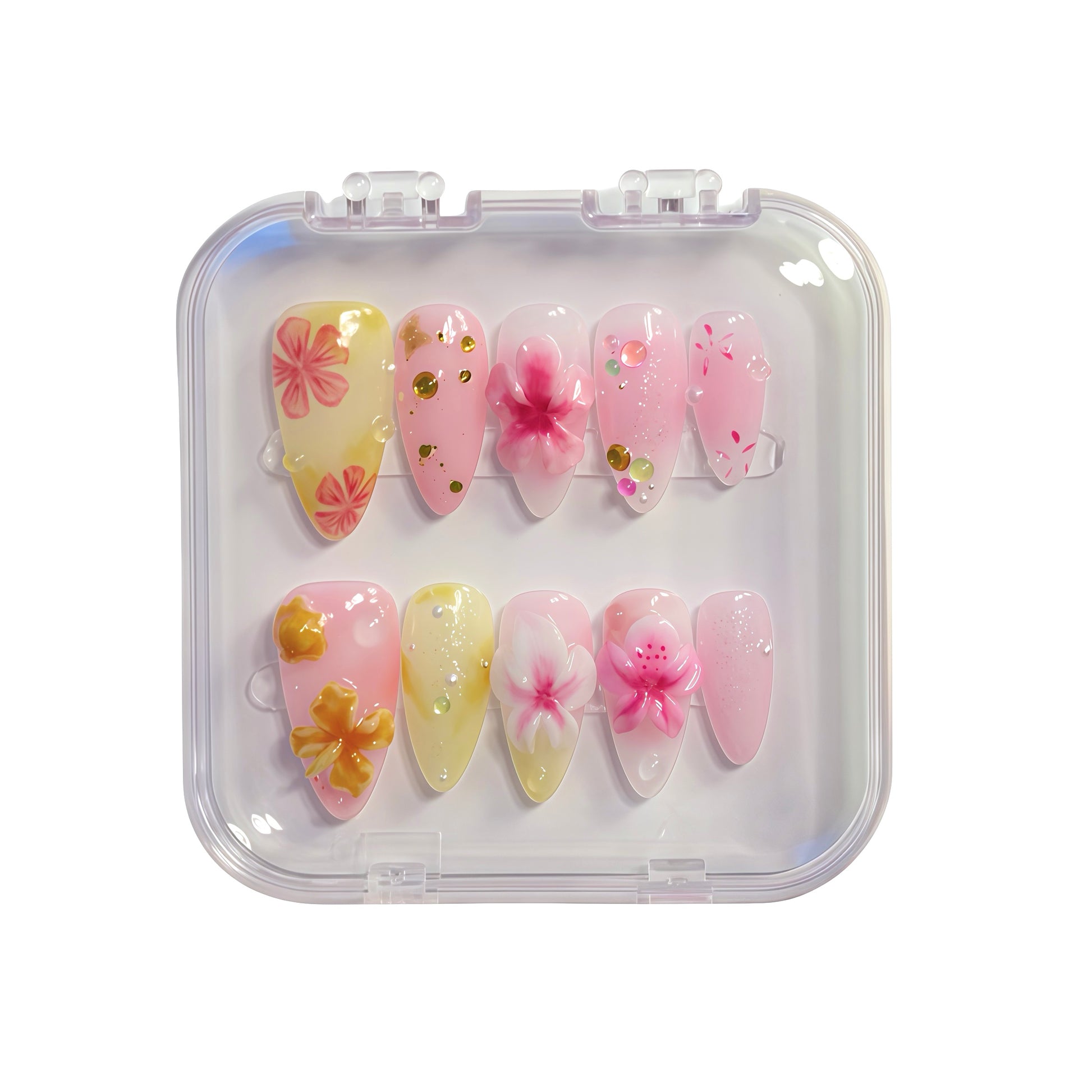 Every set comes with a FREE Toolkit includes: acrylic nail case and all complimentary tools necessary for wearing the design - sticky tabs x 24 pcs in 12 sizes, cuticle tool x 1, dehydrating wipe x 1, nail file x 1