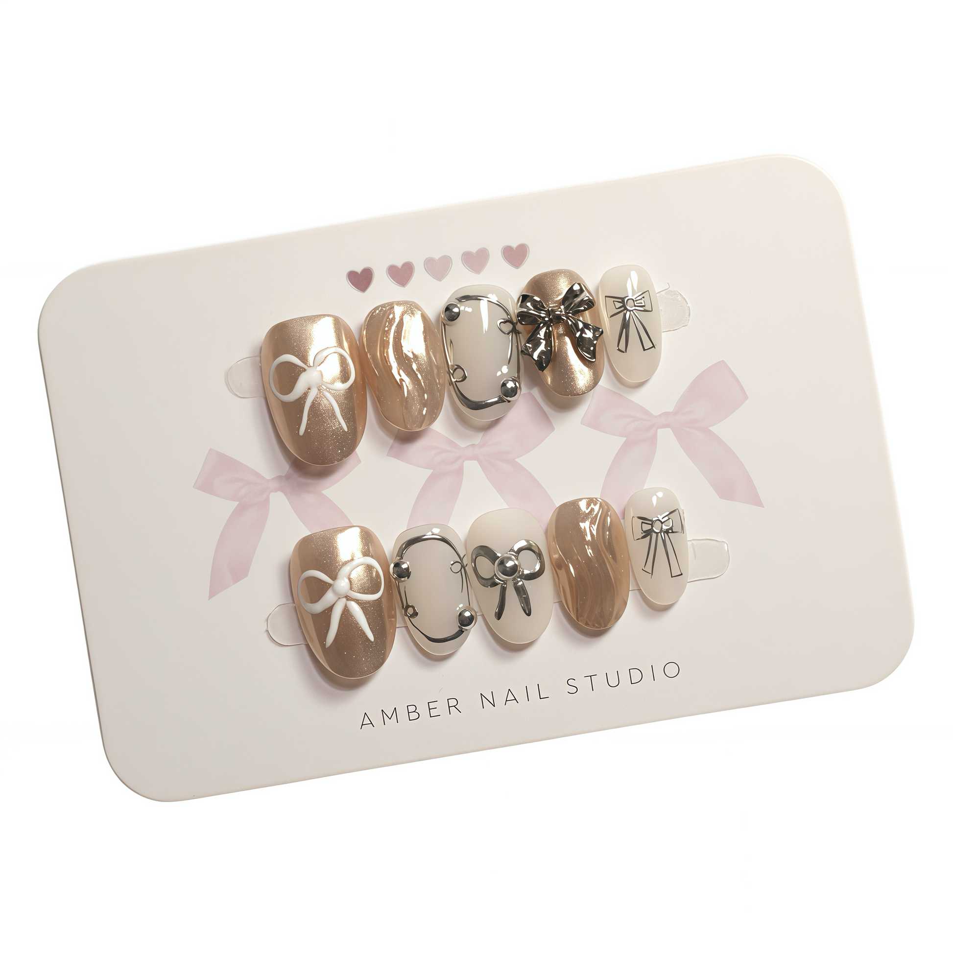The Ribbon Bow Collection is all about playful charm. Featuring handcrafted press-on nails with 3D bows, these designs bring a cute, trendy look that’s made to stand out. With bows being a viral hit on social media, this collection lets you capture that fun, stylish vibe effortlessly. Perfect for adding a chic twist to any outfit.