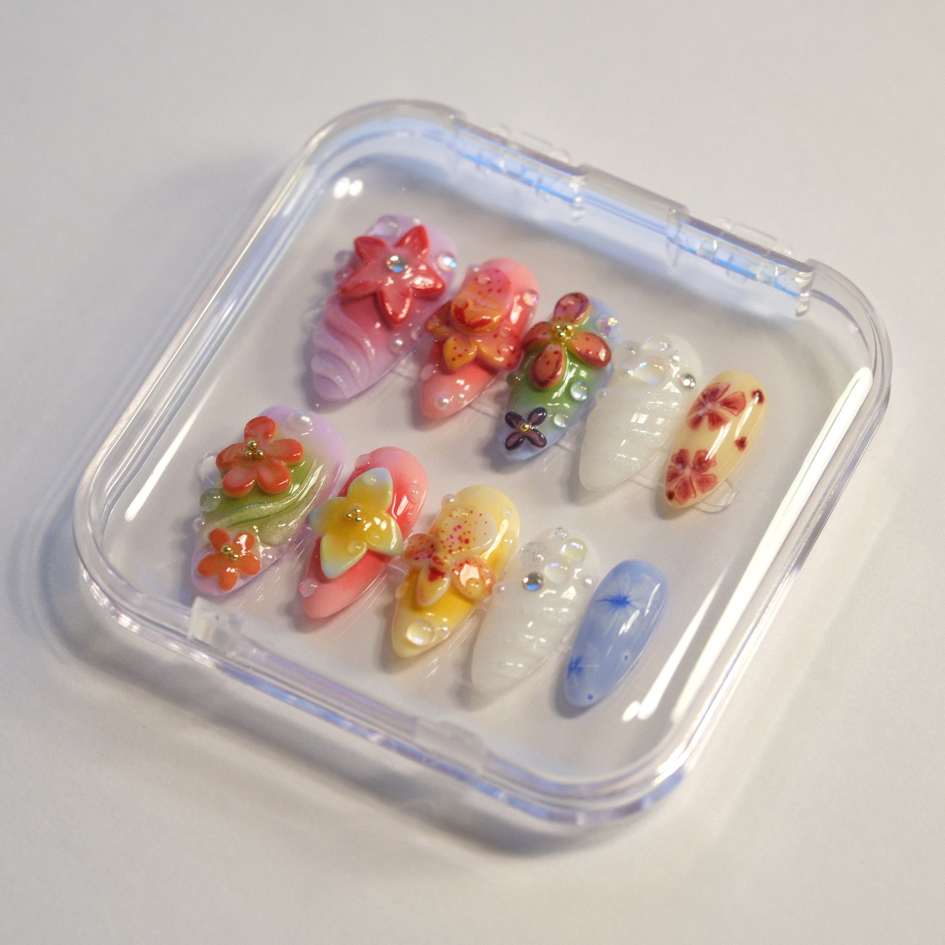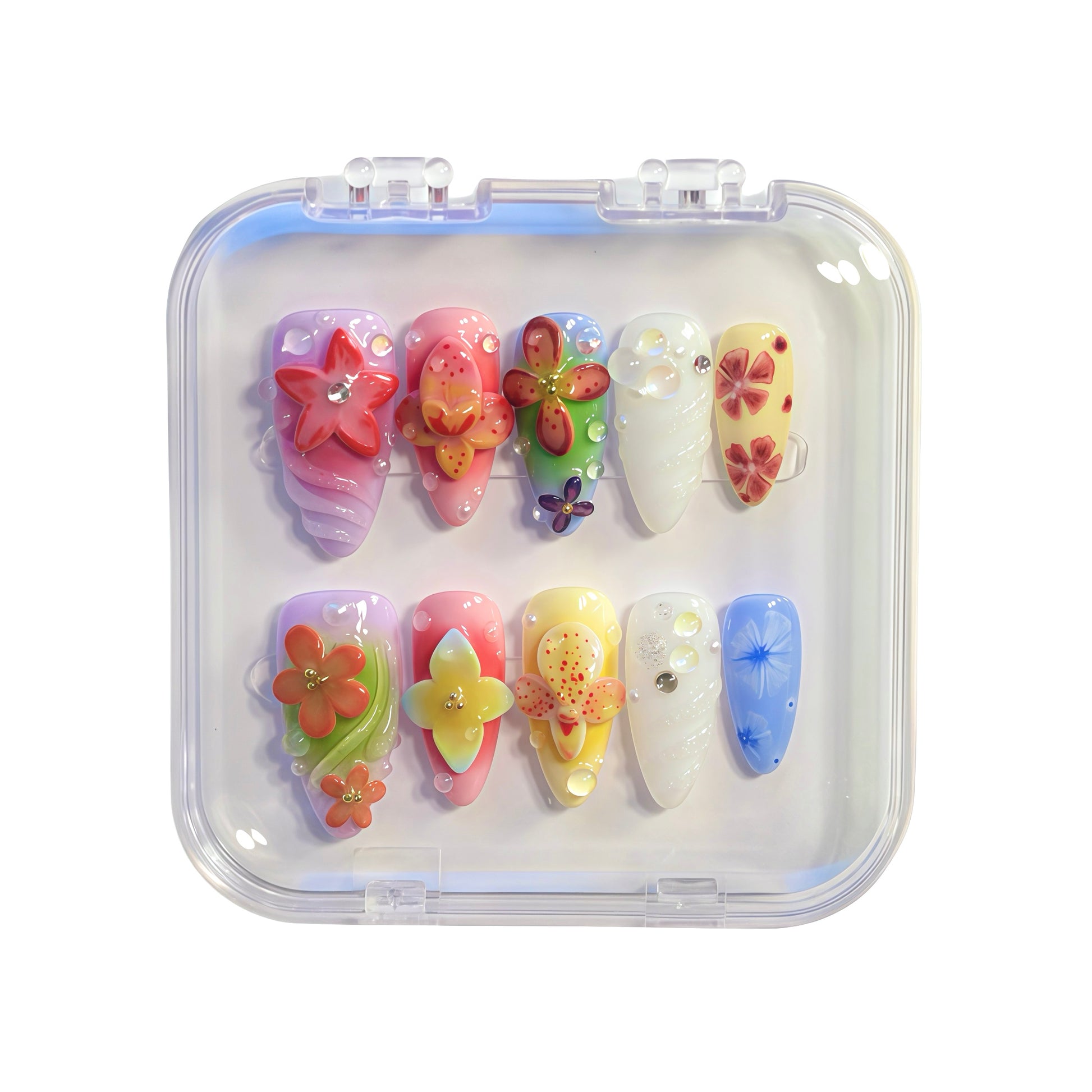 Every set comes with a FREE Toolkit includes: acrylic nail case and all complimentary tools necessary for wearing the design - sticky tabs x 24 pcs in 12 sizes, cuticle tool x 1, dehydrating wipe x 1, nail file x 1